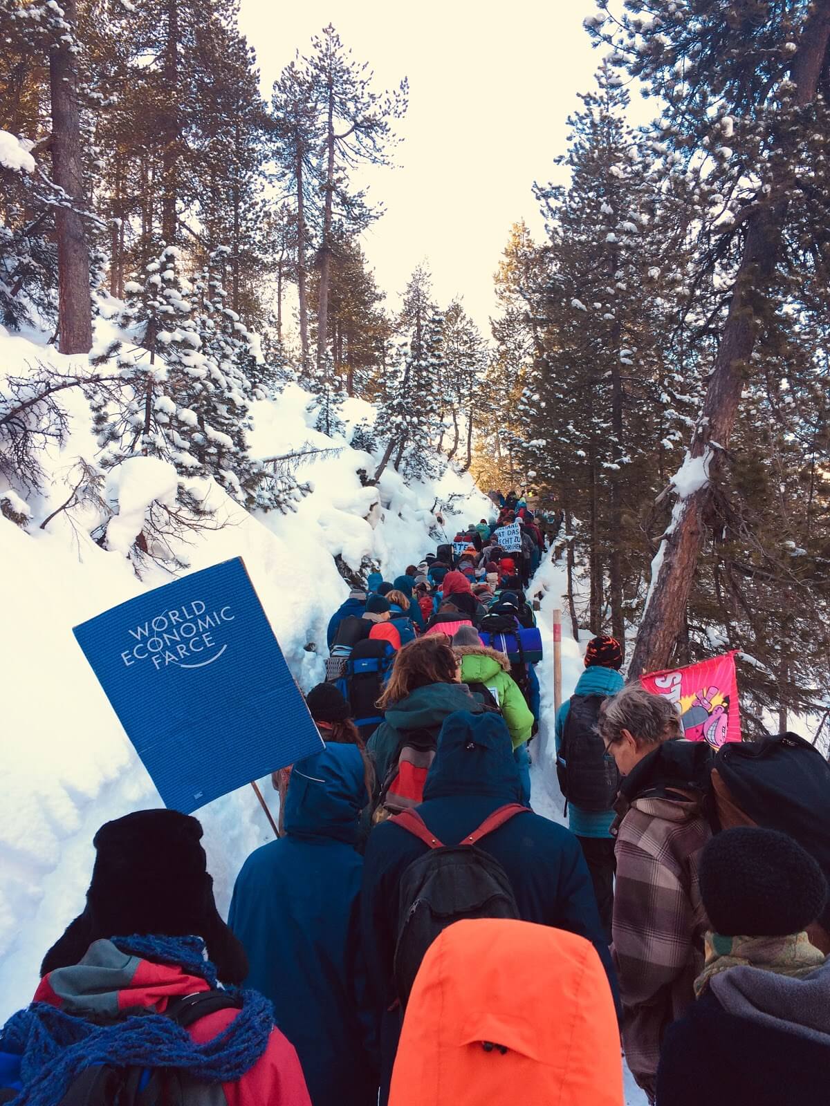 Determined rebels reached the ski resort after braving the cold on a three-day hike across the Swiss Alps. Their message to the delegates was simple. Business as usual is no longer acceptable. 100 companies are responsible for 71% of carbon emissions since 1988. They all attended the World Economic Forum.
