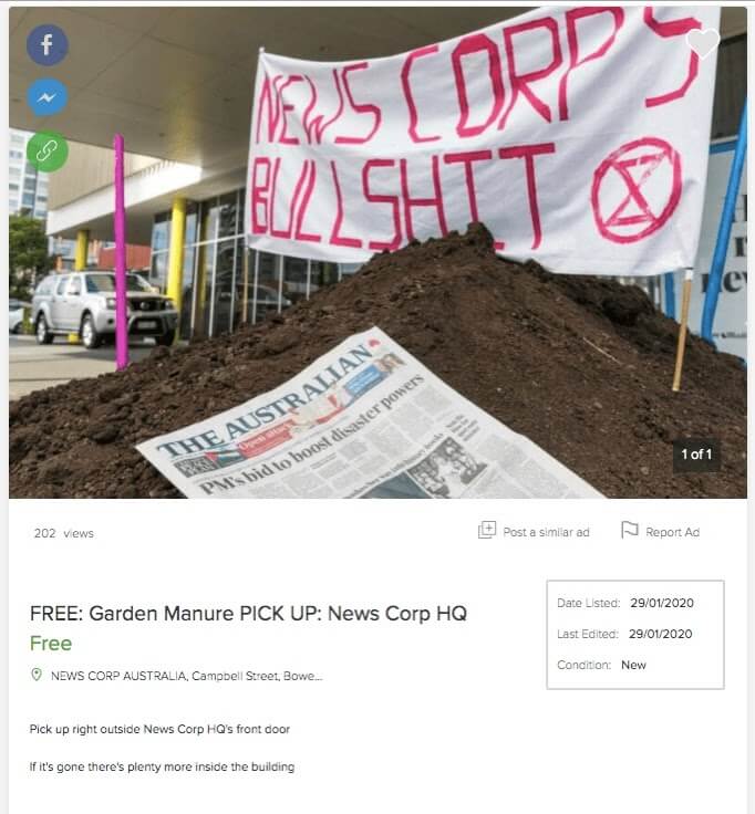 29 JAN - 1 FEB | Brisbane & Sydney, Australia On January 29, Australian rebels protested News Corp’s global campaign of climate denial and disinformation. They dumped a truckload of manure in front of the Brisbane headquarters to ‘return some of the bullsh*t that News Corp has been giving us.’ Then they glued themselves to the office doors. The group also posted a cheeky ad on Gumtree for the pile of free manure, saying ‘if it’s gone, there’s plenty more inside the building’!