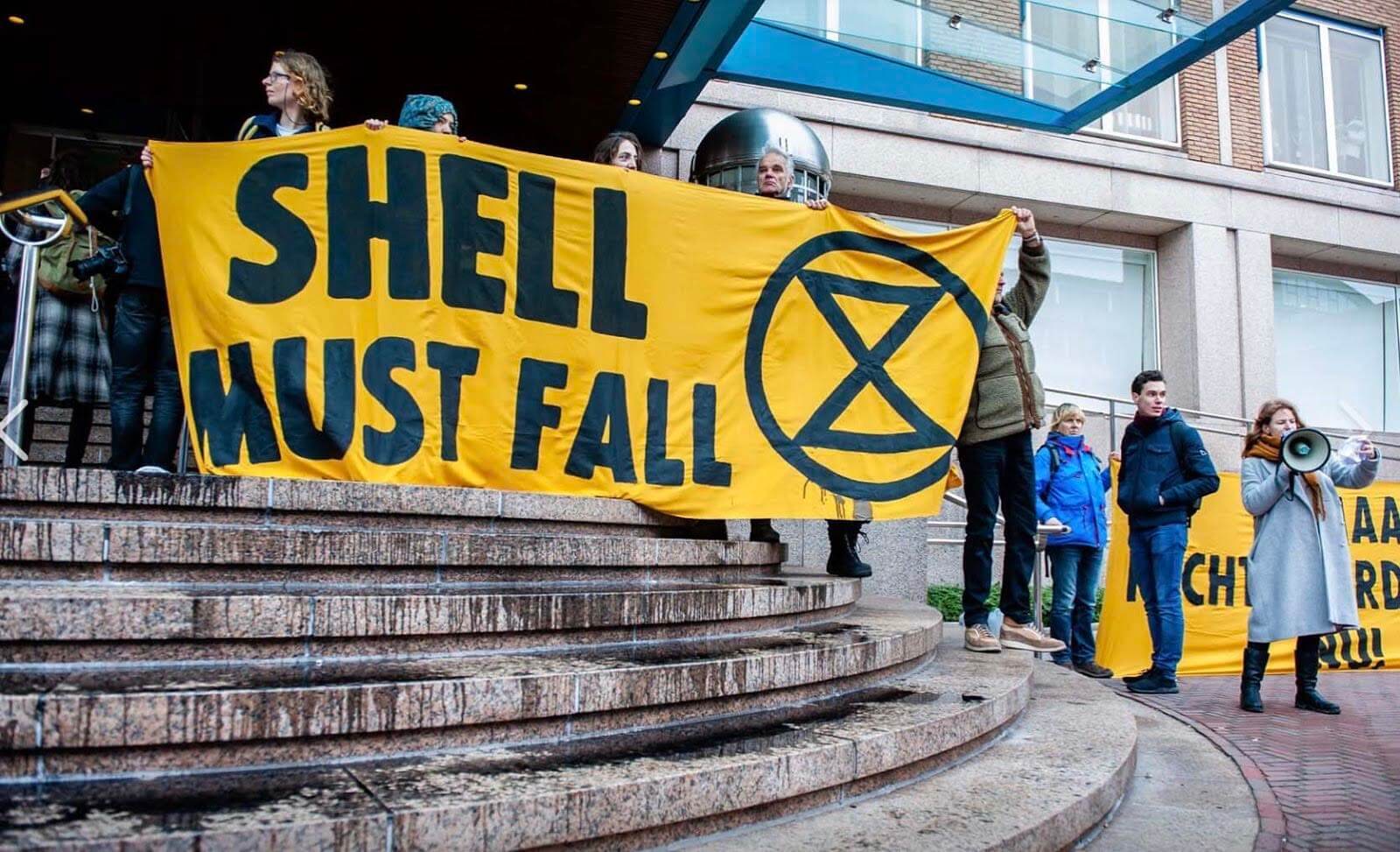 A brave group of rebels from XR Nederlands glued on to the entrance to Shell’s World Headquarters and splashed 'oil' on the front steps, as part of a coalition of activists called Shell Must Fall.