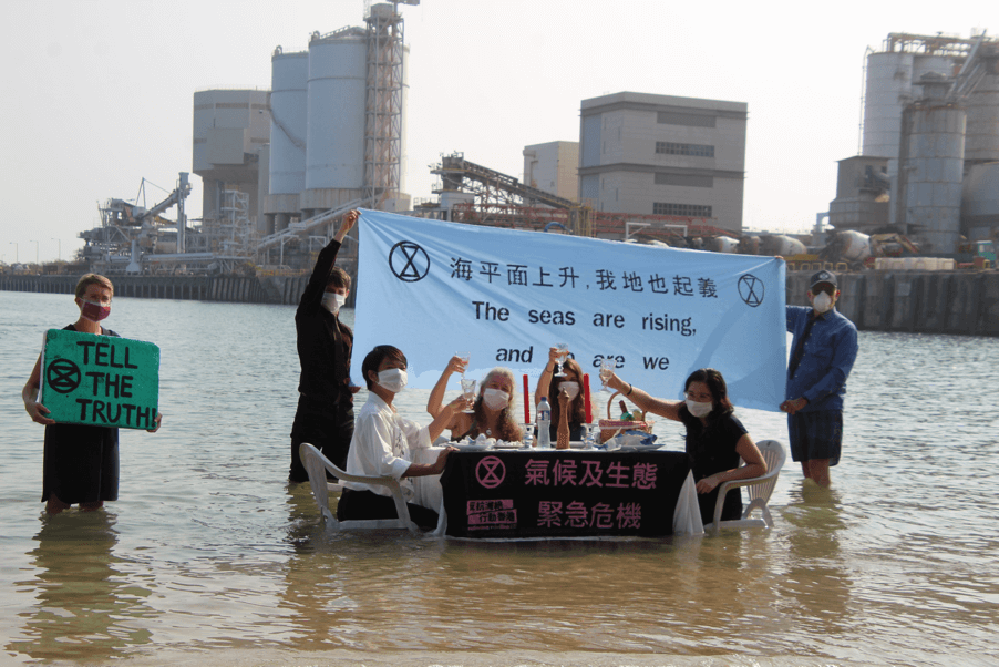 On a sunny Sunday afternoon, XRHK staged a ‘dinner party’ off a Hong Kong Beach among the waves as a reminder that – even though the media has shifted its attention to the coronavirus – we are still facing catastrophic ecological and climate breakdown.