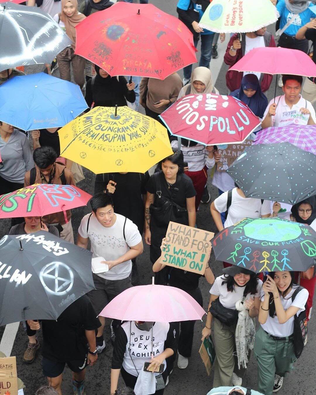 27 FEB | Jakarta, Indonesia. Living out the Indonesian proverb “Sedia Payung Sebelum Hujan”, meaning “prepare your umbrella before it rains”, local rebels painted a menagerie of messages and slogans on a multitude of umbrellas before marching.