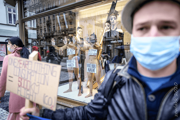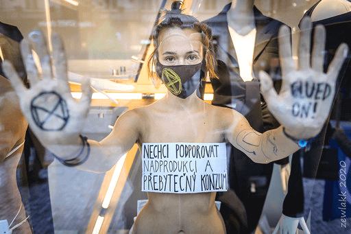 Four rebels bared all on Prague's luxurious Příkopa Street to protest fast fashion. The rebels glued themselves to the inside of a shop window completely naked except for signs with messages like ‘Fast fashion kills, I'd rather be naked’.