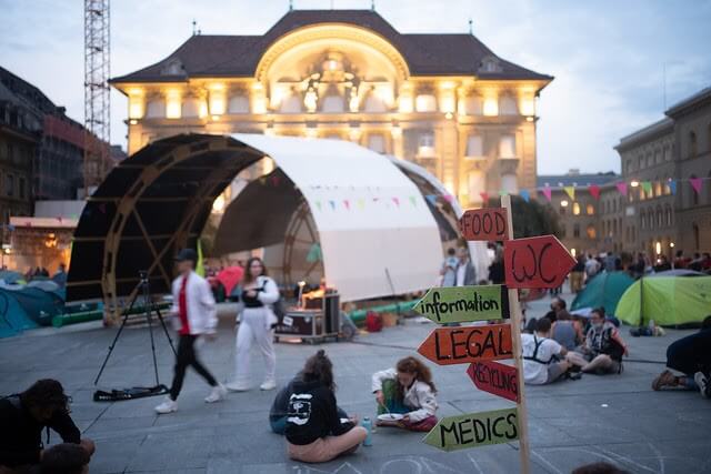 Signposting rebels around camp and government towards a just green transition. Photo: Climatestrike Switzerland