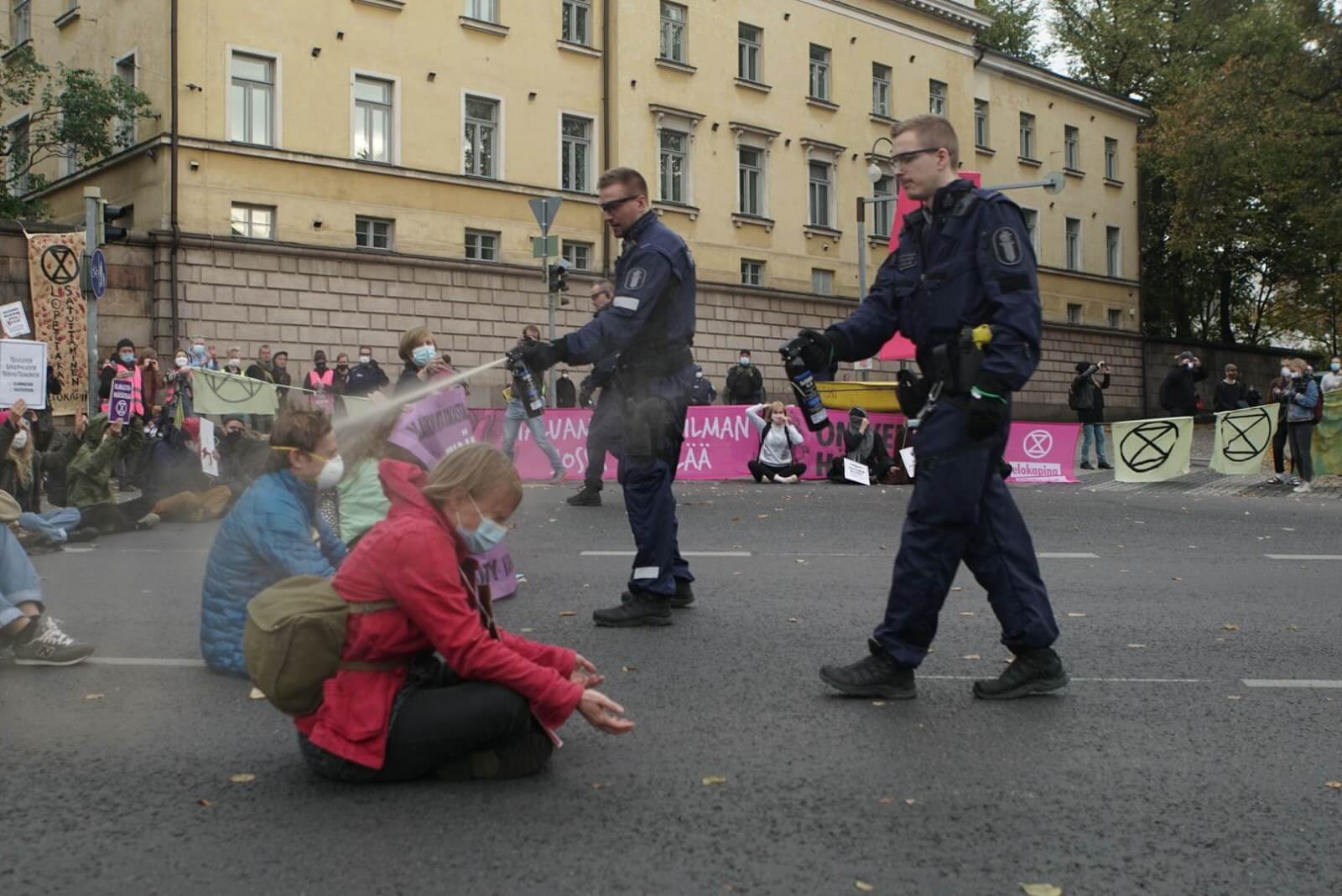 Rebels in Helsinki were pepper sprayed by police and stopped from washing their eyes during an ‘Emergency Brake’ blockade in the city centre.
