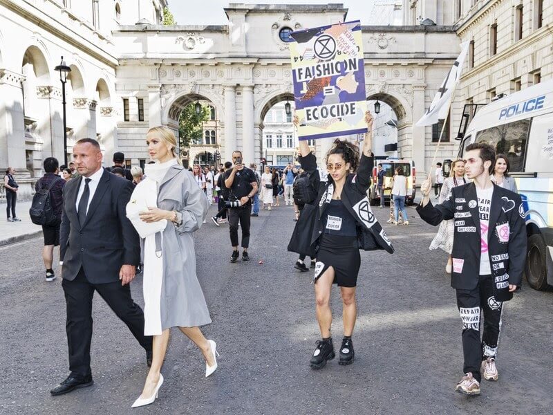 Photo: Immo Klink. XR Fashion Action protest at Victoria Beckham Show. London Fashion Week
