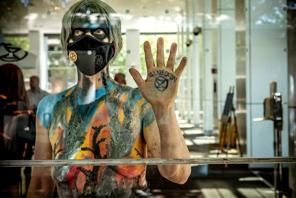 One of the 5 Sydney rebels charged with obscene exposure for gluing themselves to the Independent Planning Commission - the body that approved the Narrabri Coal Seam Gas Project. The rebels were painted to represent the recent mega-fires that ravaged the country.