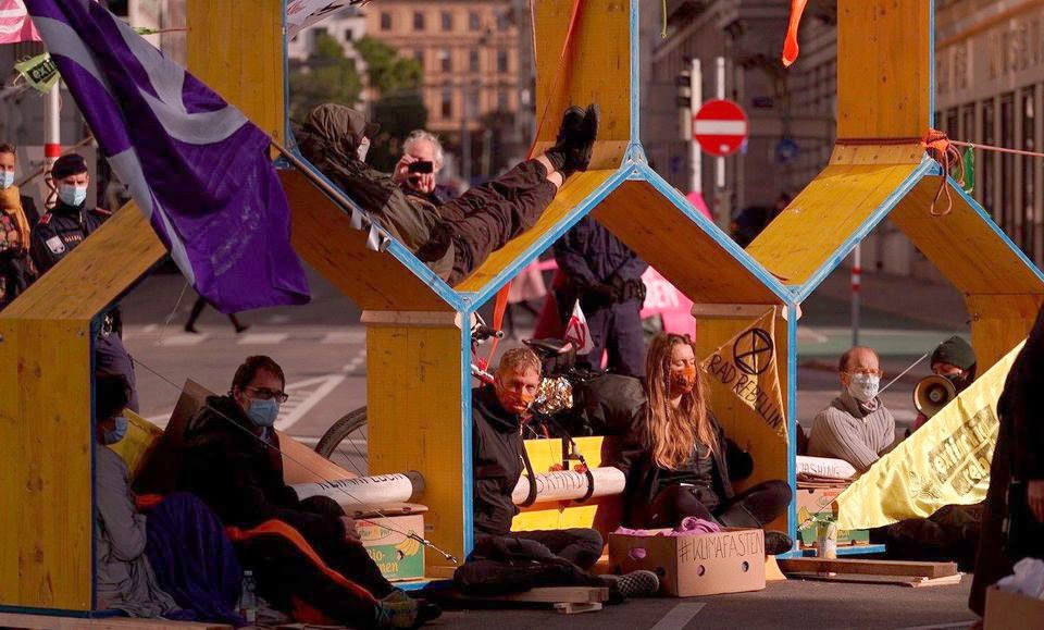 As part of their Emotional Rebellion, XR Austria block the Karlsplatz (one of Vienna’s major traffic junctions) with a wooden honeycomb construction occupied by pipe-linked rebels.