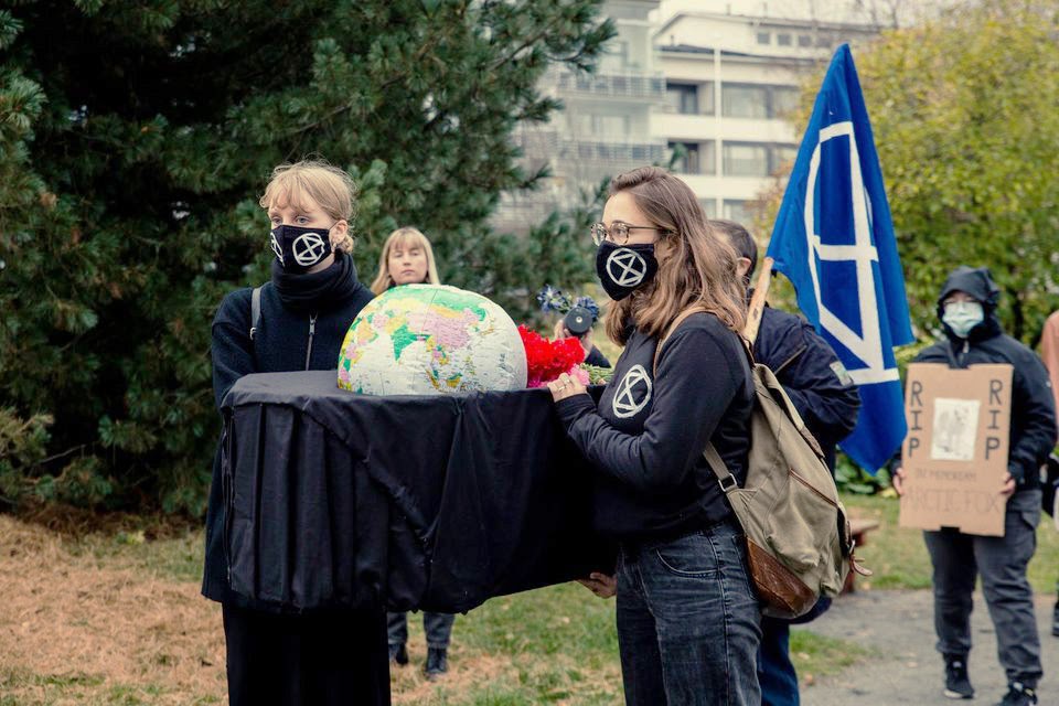 As part of the Autumn Rebellion, about 20 rebels in the Finnish city of Rovaniemi processed in mourning for the Earth. Funeral clothes and flowers, placards warning about the extinction of endangered species, and our tender planet in a coffin were accompanied by haunting music.