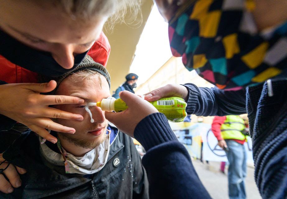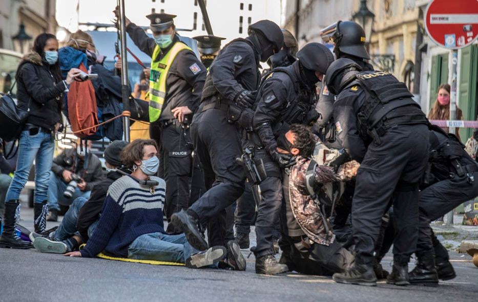 The 2020 September Rebellion in the Czech Republic reached a climax on 1 October when rebels blocked a street near the Chamber of Deputies and about 15 rebels broke away to try to nail a Declaration of the Year to the door of the Chamber. The street blockade was ruthlessly broken up with “pepper spray, violent tearing off of stuck palms, twisted limbs, swearing and humiliation, prohibition of media access, and knocking heads against the wall.”