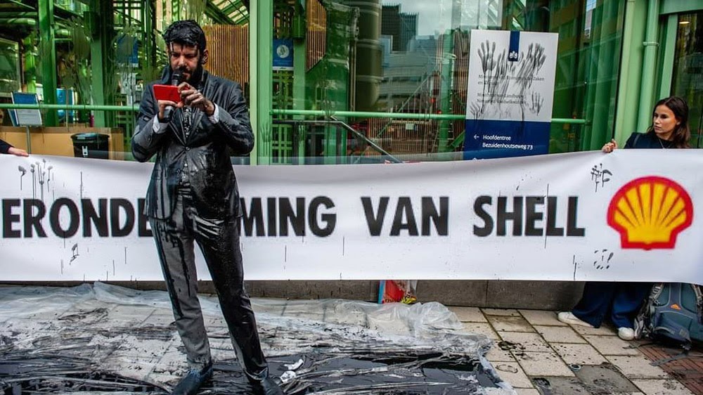 Disobedient Dutch rebels demonstrate against Shell oil company being guest of honour on the ‘Climate Day’ of the Ministry of Economic Affairs & Climate. 5 were still held in custody the next day.