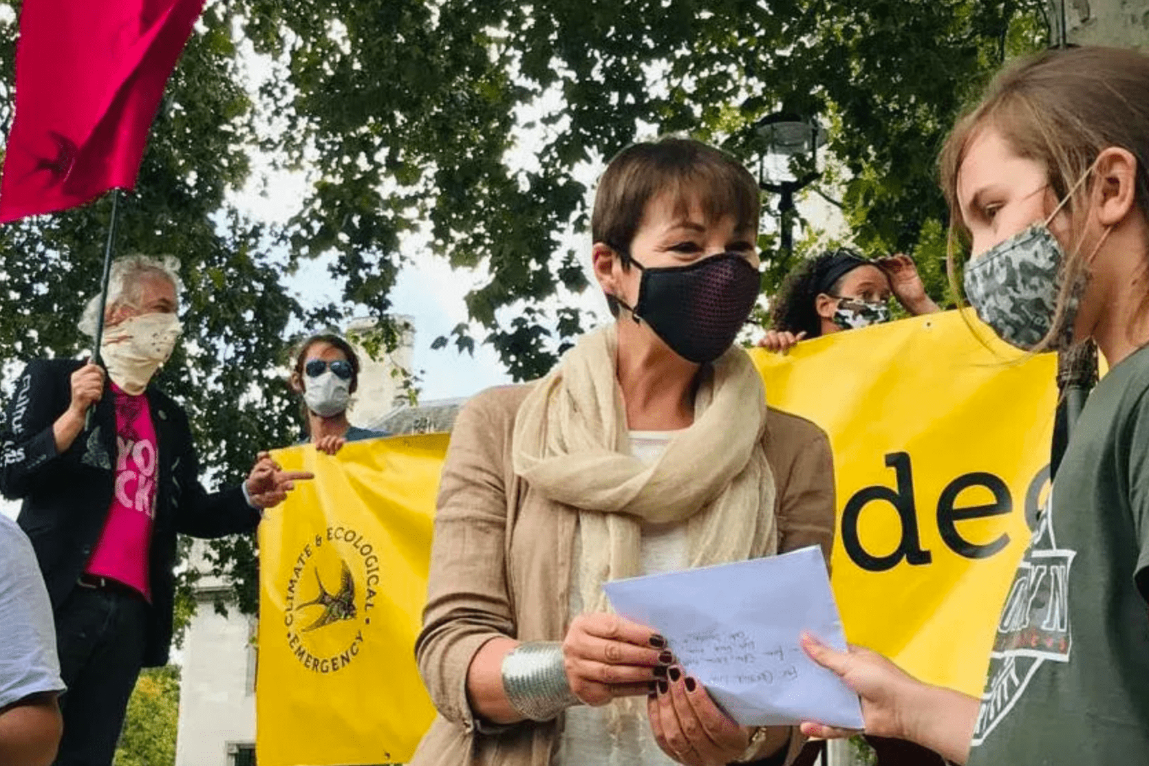 The UK’s only Green Party MP accepts a letter from young rebels before tabling the CEE Bill.