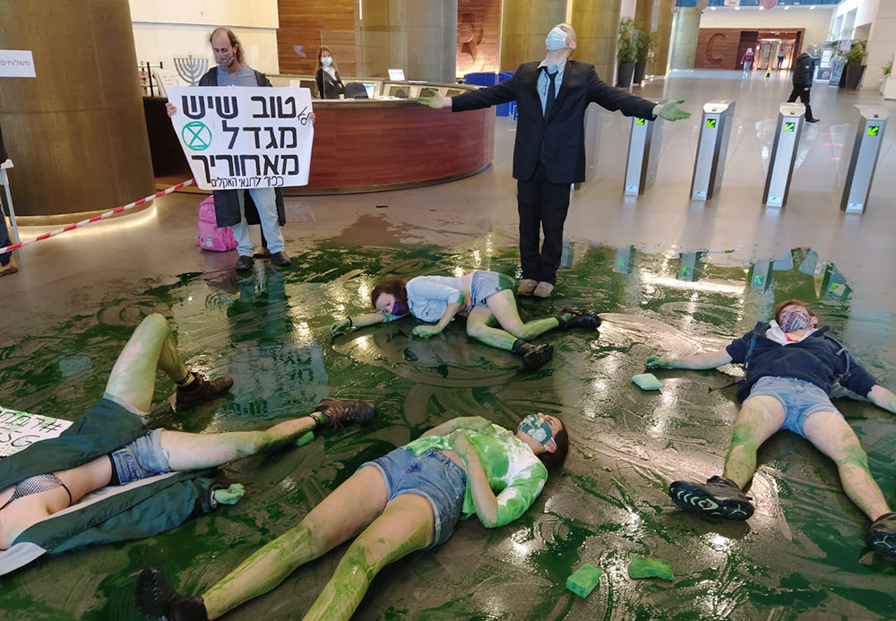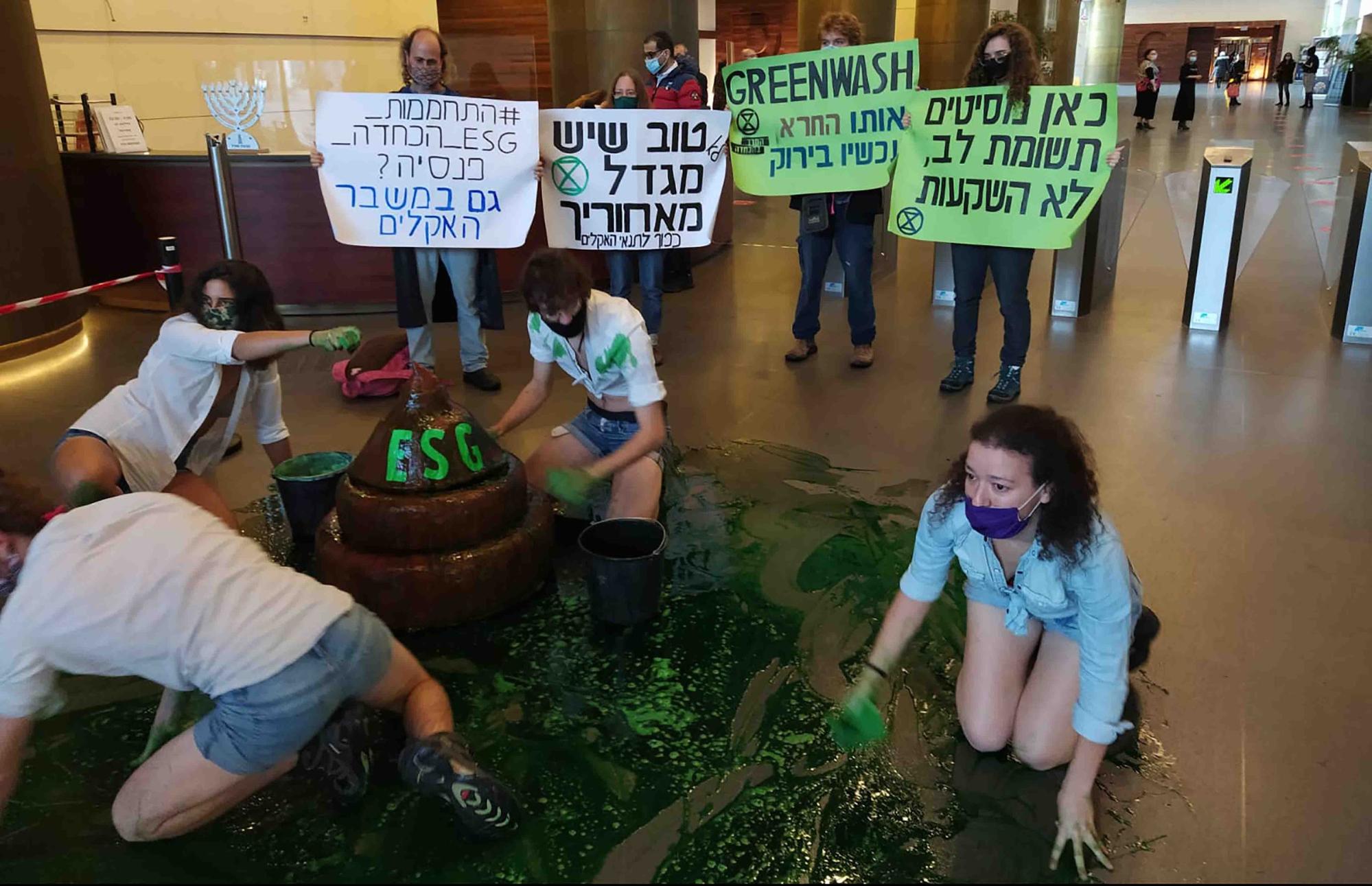 A week later rebels in the central city of Petah Tikva entered the lobby of Migdal Group, one of the biggest pension funds in Israel. To encourage the group to stop greenwashing their dirty investments, the plucky rebels brought a big pile of fake excrement with them and basted it with a generous supply of green slime.