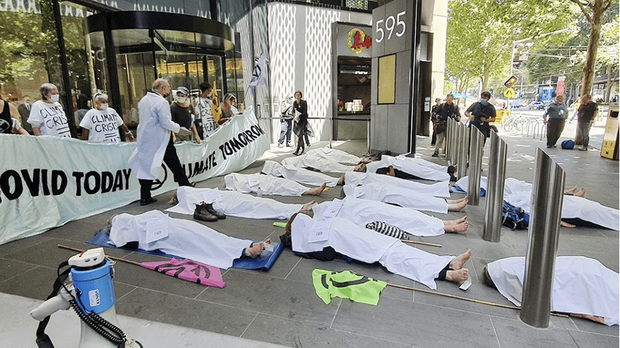 A few days later the city hosted a blockade of Victoria’s Department of Health. 4 rebels glued themselves to the entrance while a dozen more staged a ‘die-in’ outside - symbolic victims of the climate and pandemic crises.