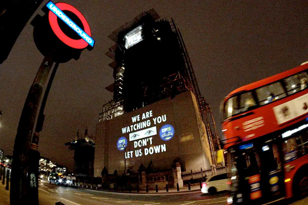 11 Dec | UK: Projections appeared in 14 cities across the world, including London (above), on the eve of the Paris Agreement anniversary. The action marked the global launch of the XR COP26 group who will pressure world leaders to deliver in Glasgow later this year.
