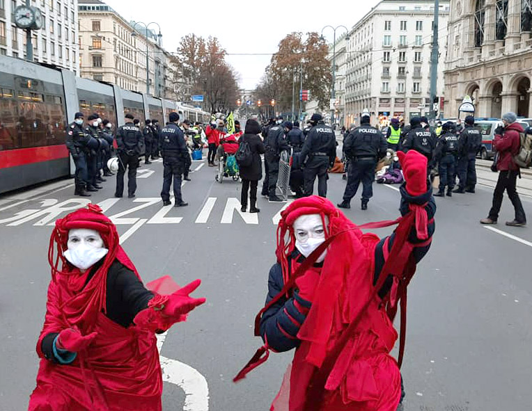 12 Dec | Austria: Red rebels and other members of XR blocked the road outside the Vienna Opera as part of the international day of action against fracking - ShaleMustFall.