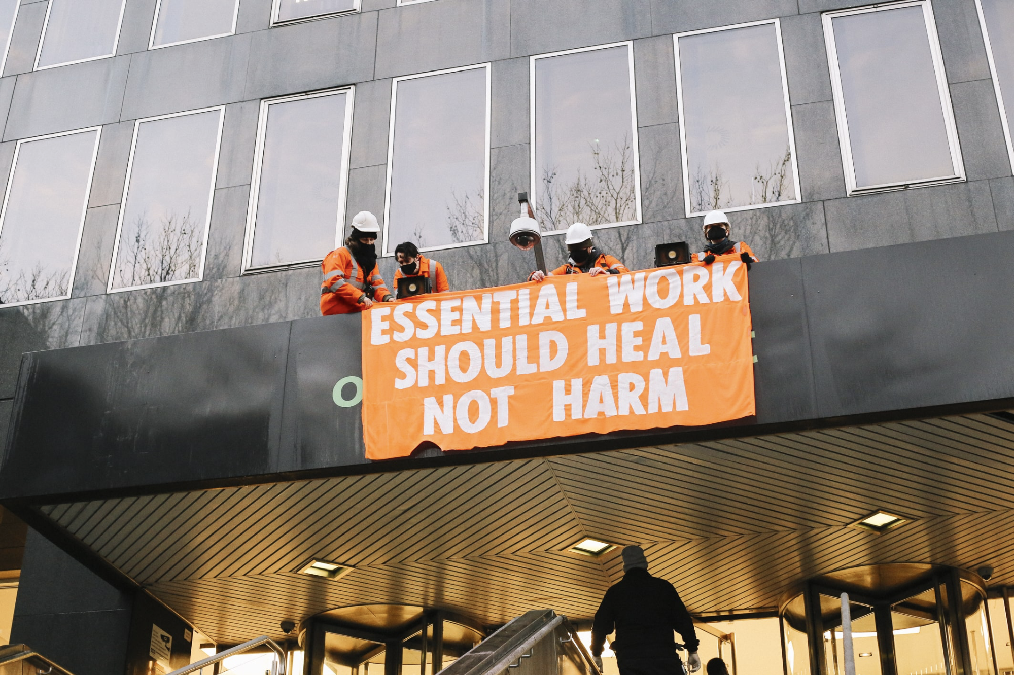 Extinction Rebellion UK has expressed solidarity with the HS2 tunnelers. A few days into the underground occupation, 4 rebels climbed onto the roof of the HS2 offices for a banner drop.