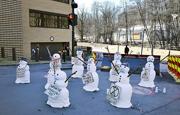 Snowpeople block the exit of the Ministry of Justice but avoid fines Photo: XR Norway