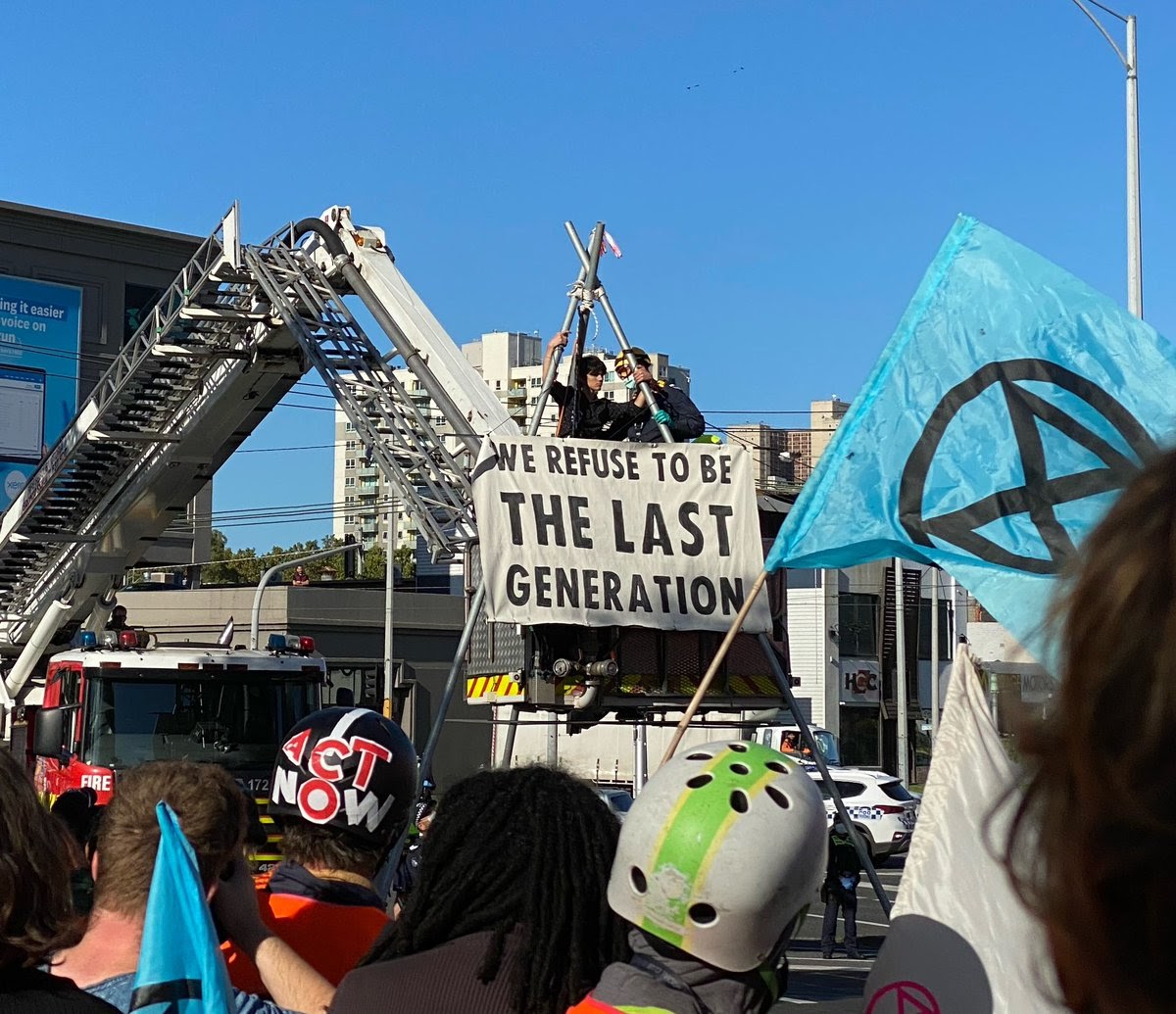 25 MARCH | Melbourne, Australia A teenage rebel is removed from a 6m high steel tripod blocking a major freeway. The action was part of a one week Autumn Rebellion.