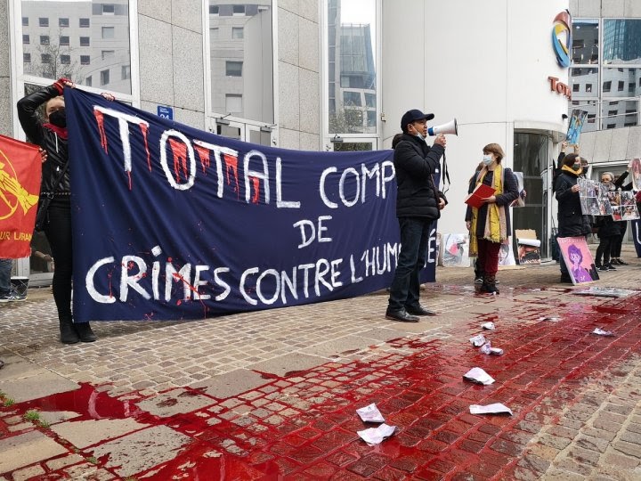 25 MARCH | Paris, France Rebels & other activists show photos of killed and maimed Myanmar protestors outside the HQ of Total. The oil giant funds Myanmar’s junta. Photo: Reporterre