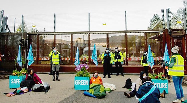 30 APR | Faslane, Scotland. Three women from XR Scotland attached themselves to giant flower containers and blocked the north gate of the Faslane nuclear submarine base to demand a “Safe Green Future” free from the threat of nuclear weapons and environmental destruction as part of the International Peace Lotus Campaign.