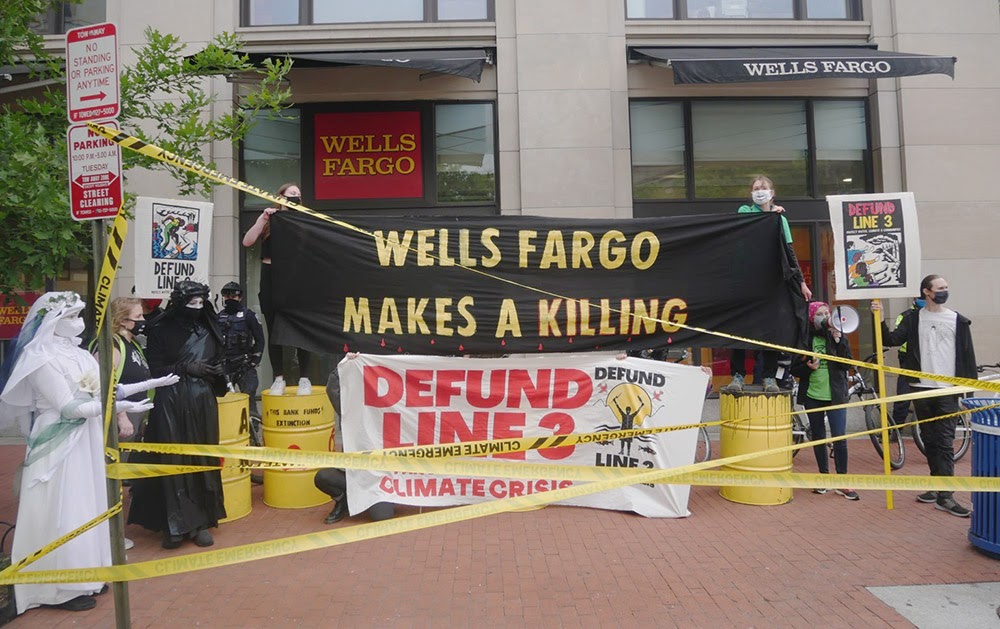 7 MAY | Washington DC, USA. Rebels smeared fake oil over Wells Fargo and demanded that the bank stop funding the Line 3 tar sands pipeline, which is on indigenous Anishinaabe land in northern Minnesota.