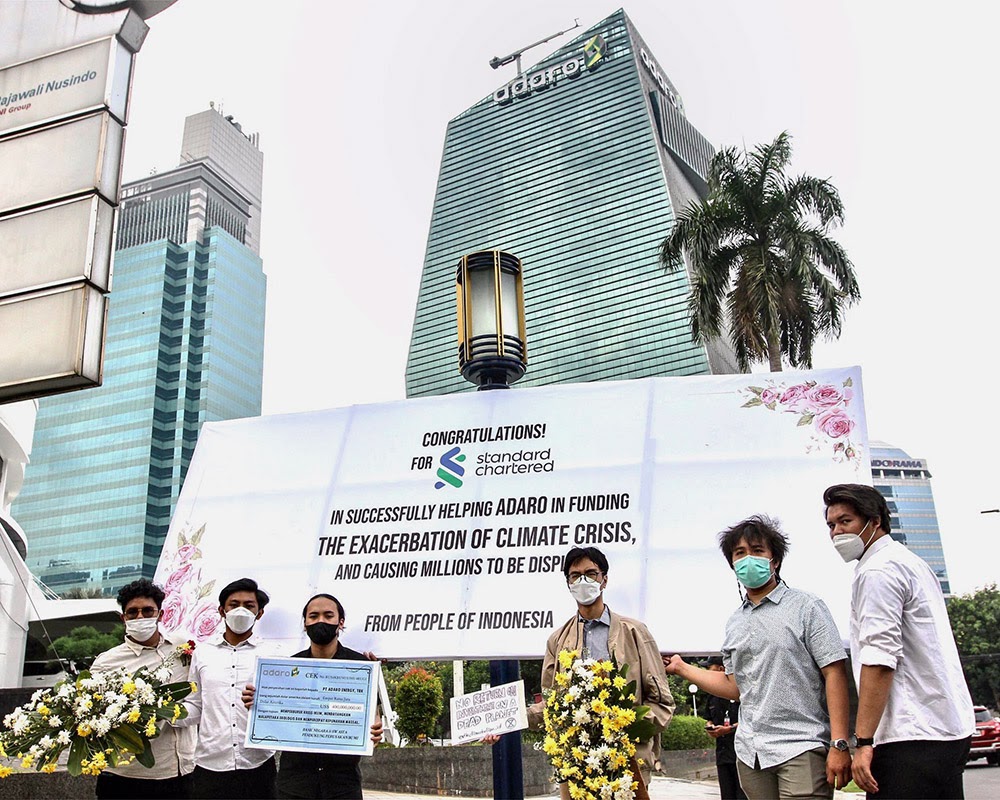 3 MAY | Jakarta, Indonesia. Rebels “congratulate” Standard Chartered bank on funding the Indonesian coal miner, Adaro Energy. At Tabalong on the island of Borneo, Adaro operates the largest single-site coal mine in the southern hemisphere (110,000 tons of coal per day).