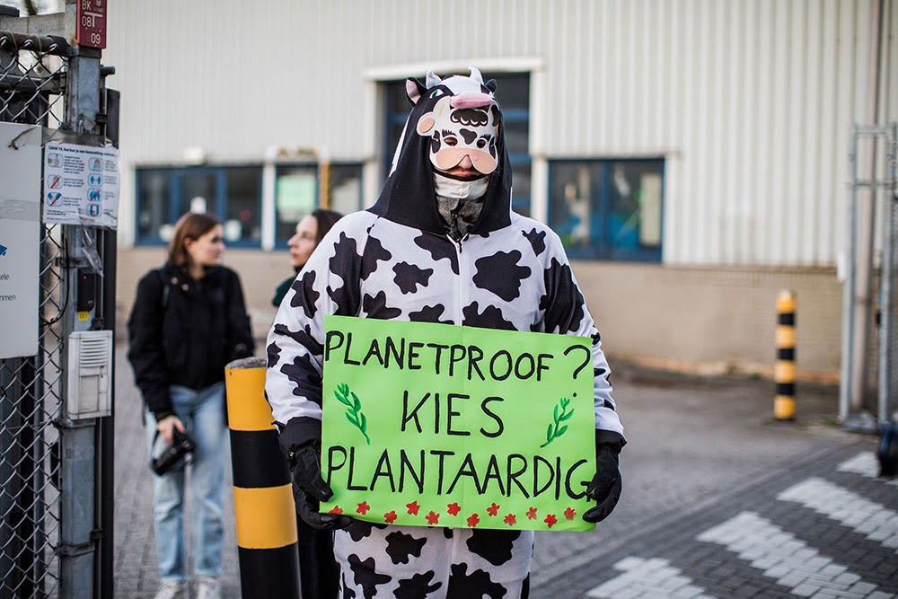 7 APR | Rotterdam, Holland. Animal Rebellion Netherlands and XR Rotterdam occupied FrieslandCampina. The giant dairy multinational refuses to acknowledge the harmful impact of dairy on our planet. The placard: “Choose vegetables”.
