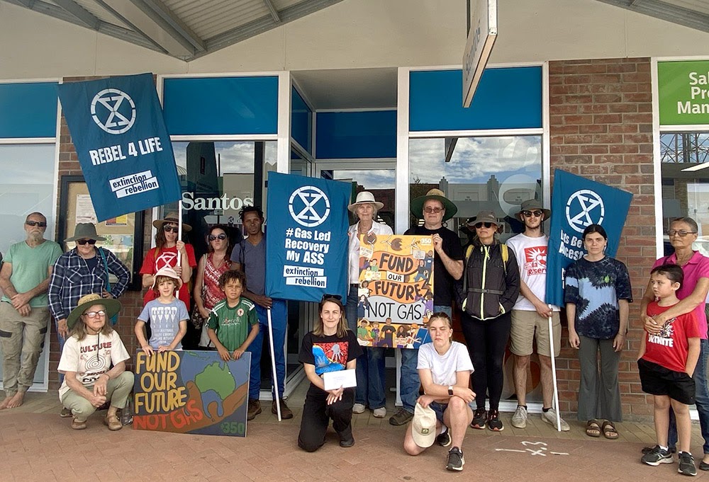 15 APR | Narrabri, Australia. Rebels descended on the Narrabri offices of Santos Ltd, the country’s 2nd largest independent oil and gas producer, to deliver a statement in solidarity with Linda Whitten of the indigenous Gomeroi people who are trying to prevent Santos’ Narrabri Gas Project desecrating and destroying their sacred lands.