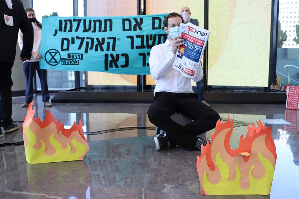 27 APR | Tel Aviv, Israel. Rebels entered the offices of Menora Mivtachim investment company with simulated oil tanks and called on them to wake up to the climate crisis. It’s the 4th time rebels have invaded Menora & they’ll continue to until divestments happen.
