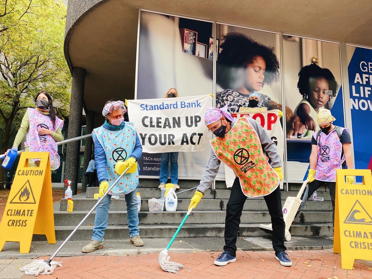 27 MAY | South Africa: Cape Town rebels clean up outside Standard Bank on the day of its AGM. The dirty bank finances fossil fuels and the East Africa Crude Oil Pipeline.