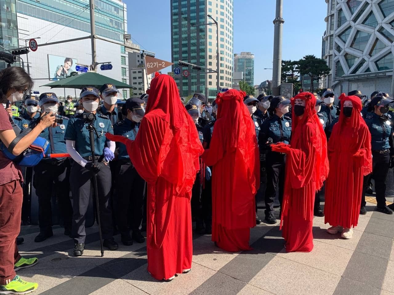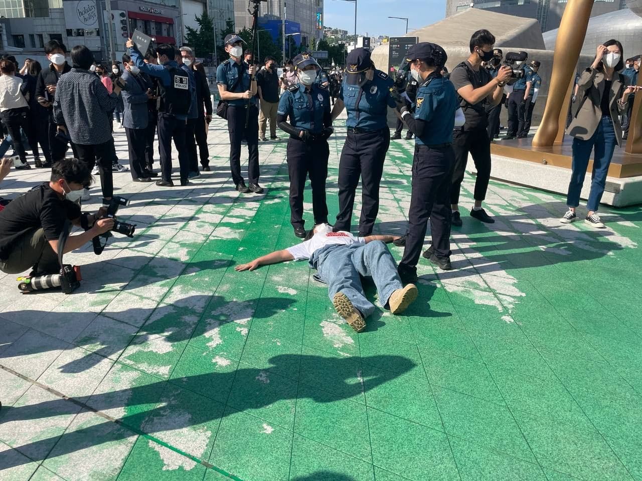 On the day of their president’s summit speech, Korean rebels organised a more literal take on this gratuitous greenwashing. On the plaza outside the venue, 13 rebels splashed the ground with green paint then attempted to unroll their specially prepared protest banners.