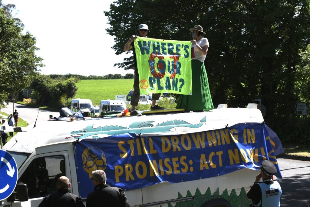 Police responded fast and in numbers, using a cherry-picker to remove the locked-on rebels from the van’s roof, and clearing both blockades within a couple of hours.