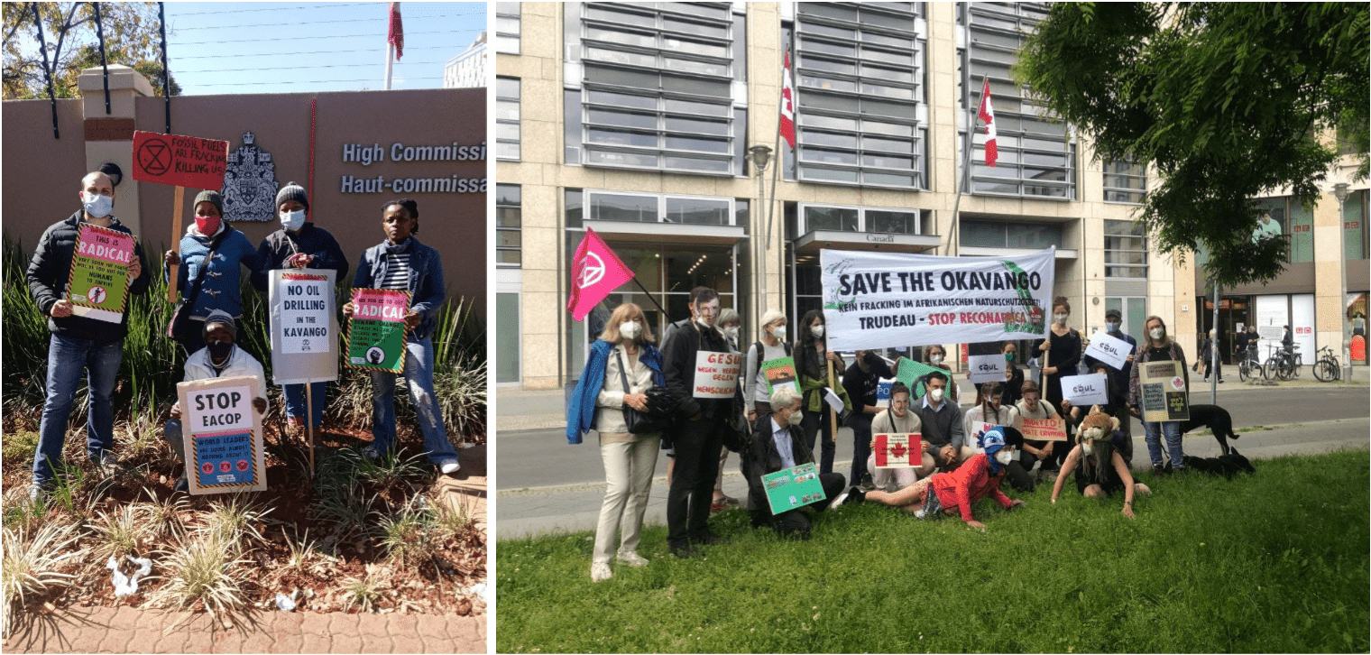 4 JUNE | Global: Rebels in South Africa (left), Germany (right), and many more countries gathered outside Canadian Embassies to protest the exploitation and destruction of Namibia’s Kavango Basin by Canadian oil company ReconAfrica.