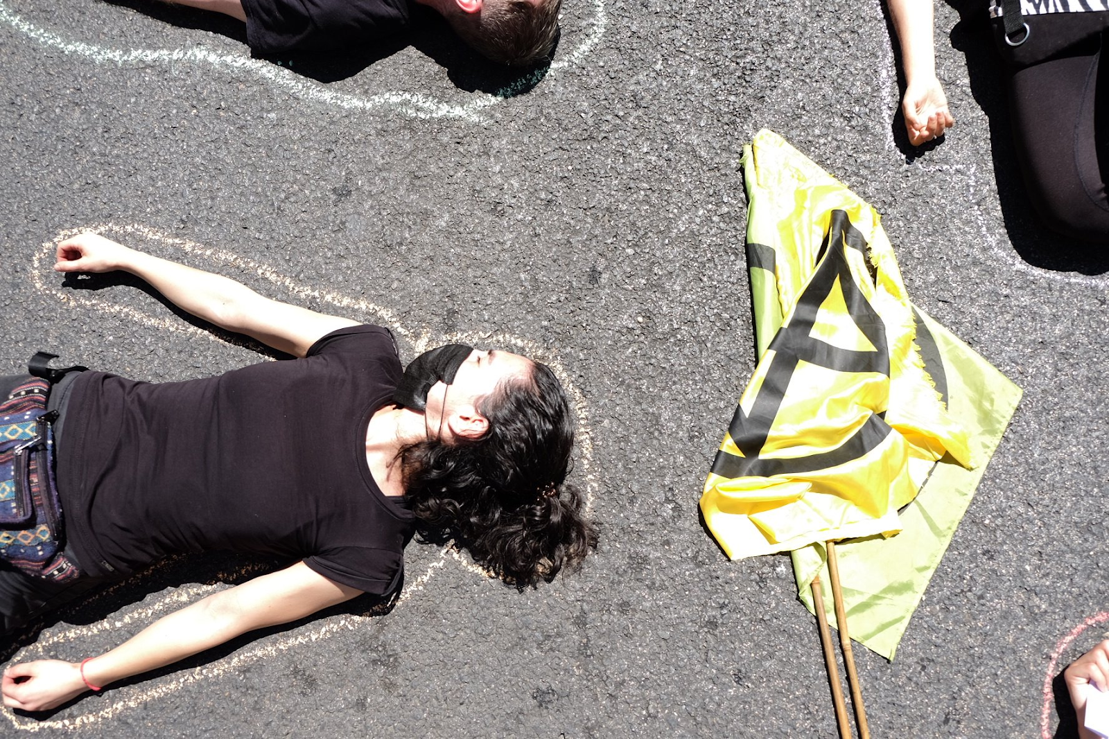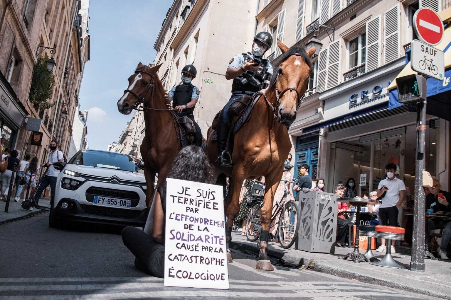 Sign: ‘I am terrified by the collapse in solidarity caused by the Ecological Crisis.’ 45 rebels sat in streets across France. 2 were arrested, 1 got slapped in the face, but many more were supported and even joined by passers by.