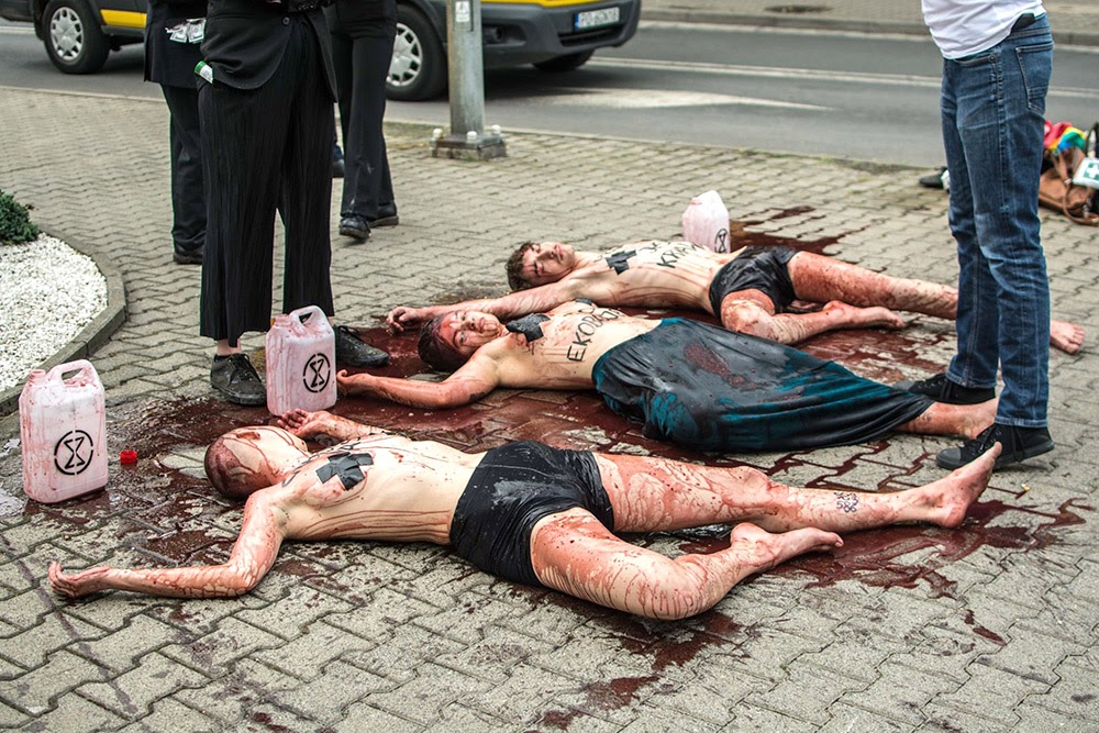 24 JUN | Wroclaw, Poland: Temperatures have also been soaring in Poland. Blood and heat death were the themes of this rebel action in Wroclaw against coal-fired power company Kogeneracja SA, part of the Polish energy conglomerate PGE.