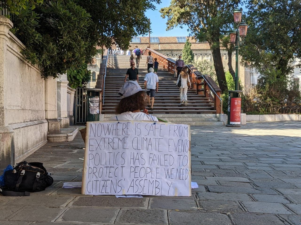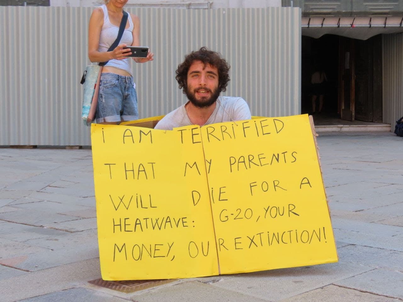 A Rebellion of One in Venice during the G20 summit. The sign hits the nail on the head. Each sitter had copies of a personal letter to hand out to confused passers-by.
