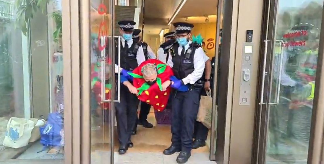 21 JUNE | UK: Fruity rebels from Plastic Rebellion are removed from the HQ of ‘Innocent’ and arrested. But it is the global drinks company that’s guilty of gratuitous greenwashing.