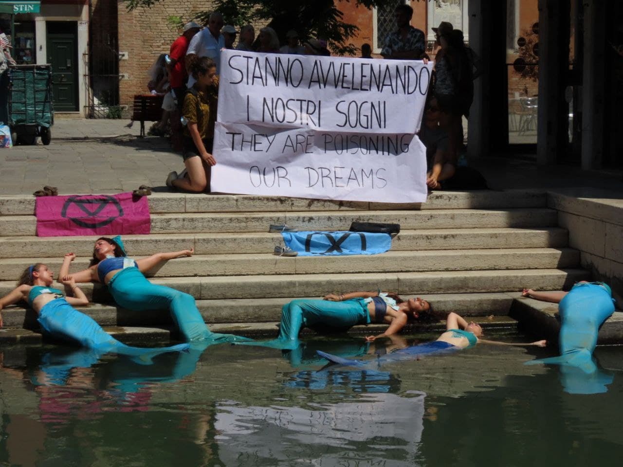A group of mermaids lay lifeless along a canal to highlight the death of our children’s dreams, our ocean life, and Venice itself. The city is destined to be underwater before the end of the century, and could be classified as an Unesco endangered site within weeks.