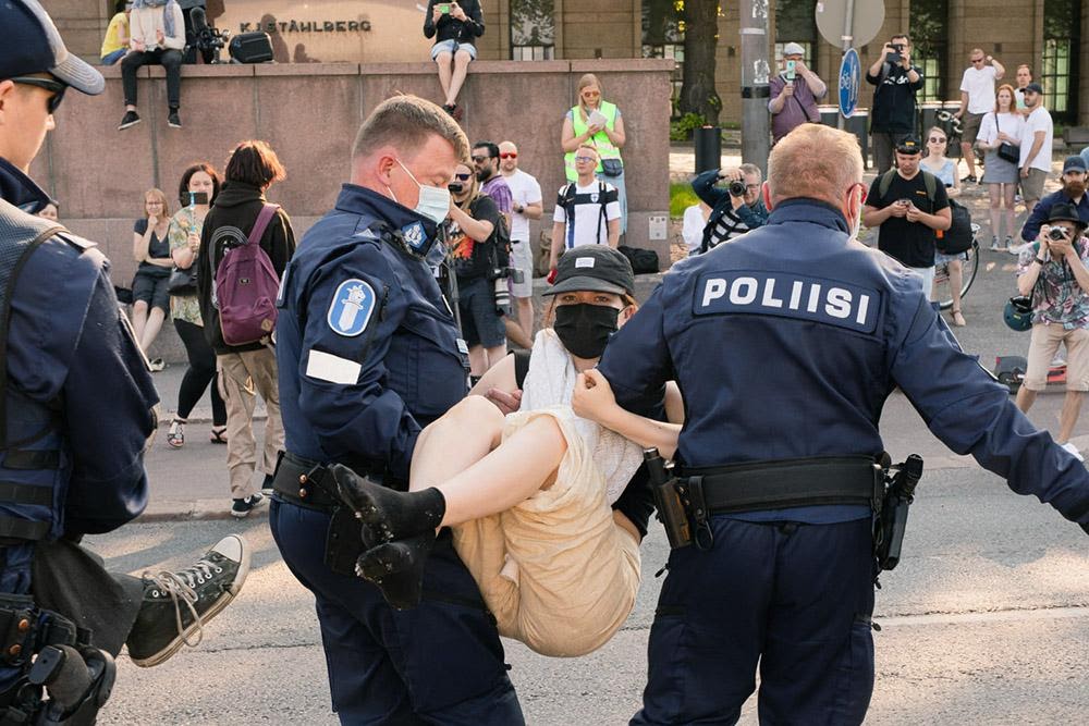 Police clear a blockade outside the Finnish Parliament Photo: Pietari Purovaara/ Elokapina