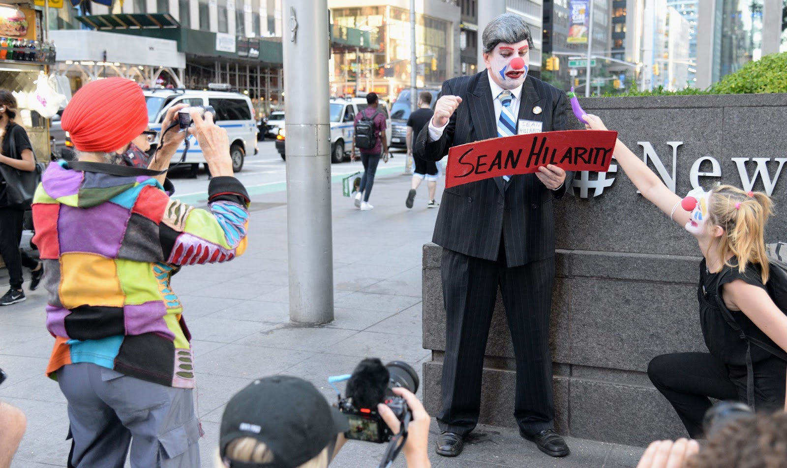 Part time clowns outside Fox News HQ (full time clowns inside). Photo: Felton Davis