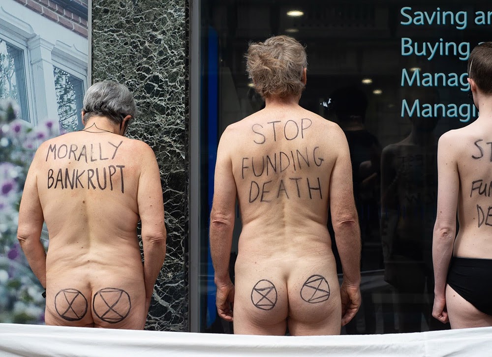 Rebels strip outside Barclays and HSBC banks in London. We’re all vulnerable if we don’t stop investing in fossil fuels. Credit: Helena Smith.