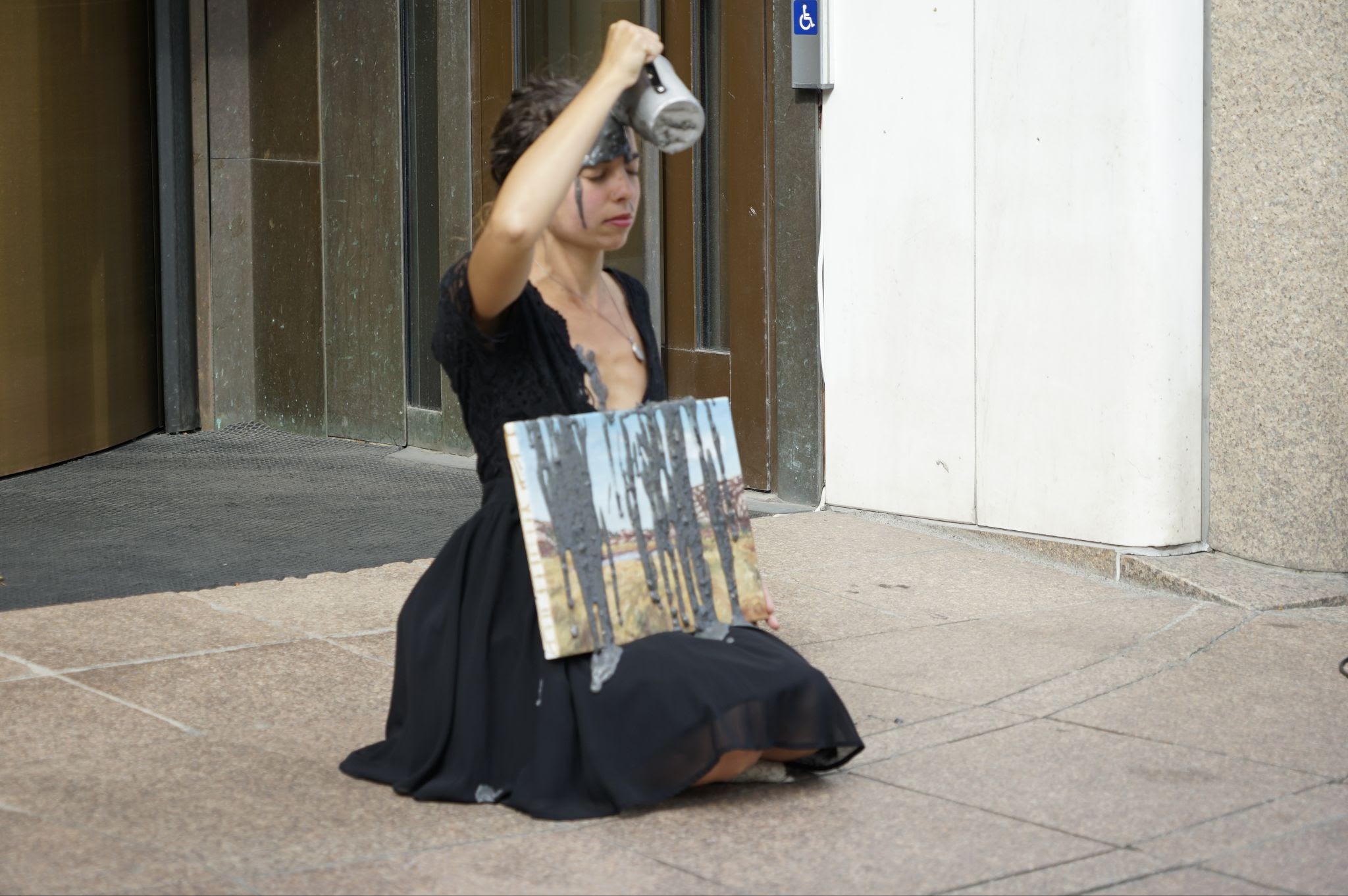 As the March passes the Transport Ministry, a rebel artist pours makeshift asphalt over herself and her painting of an area that will be destroyed for a new highway.