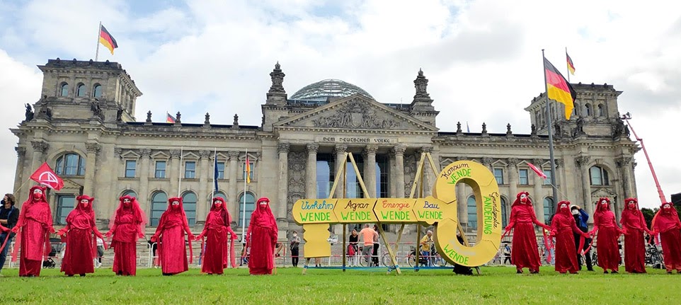 Rebels also occupied the building of the CDU’s economic council, chalking down helpful suggestions like “change your diet, not the climate”. They later blockaded the state building of North Rhine Westphalia - Germany’s mining and industrial heartland. Rebels operated small excavators next to a pile of coal while wearing masks of fossil fuel friendly politicians.