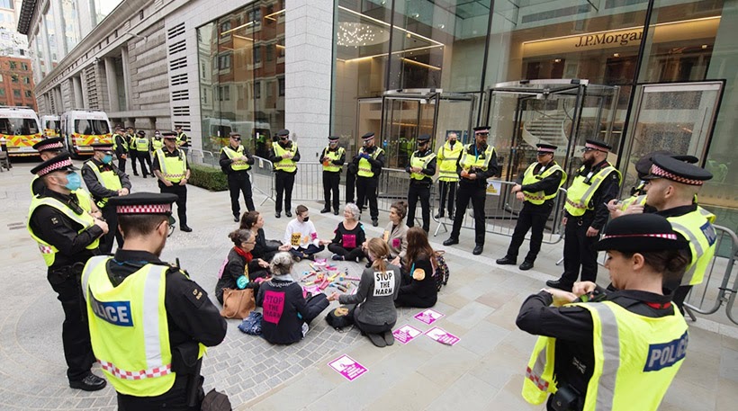 IN CASE OF CLIMATE EMERGENCY, BREAK GLASS: XR women await arrest after breaking windows at JP Morgan (the ‘World’s Worst Bank’) Credit: Gareth Morris.