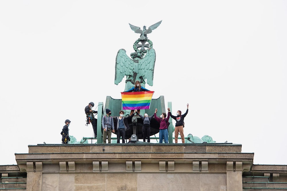 Rebels rise up to the top of the Brandenburg Gate. Credit: Stefan Müller.