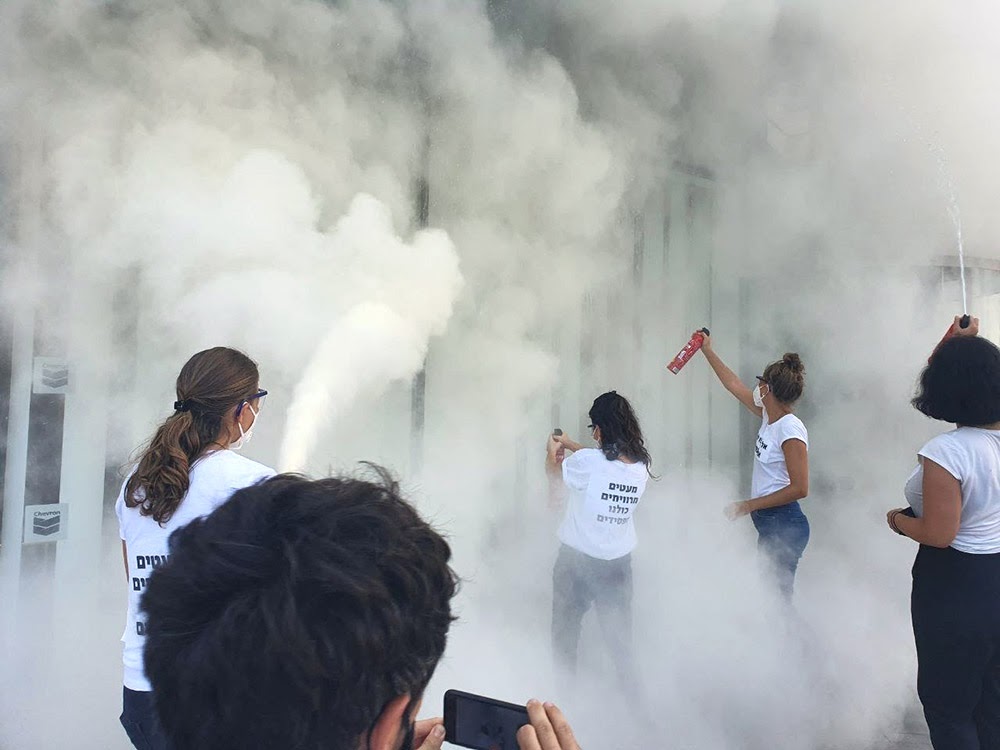 25 AUG | Herzliya, Israel. Rebels use fire extinguishers to spray-paint the Israeli headquarters of the American oil company Chevron.