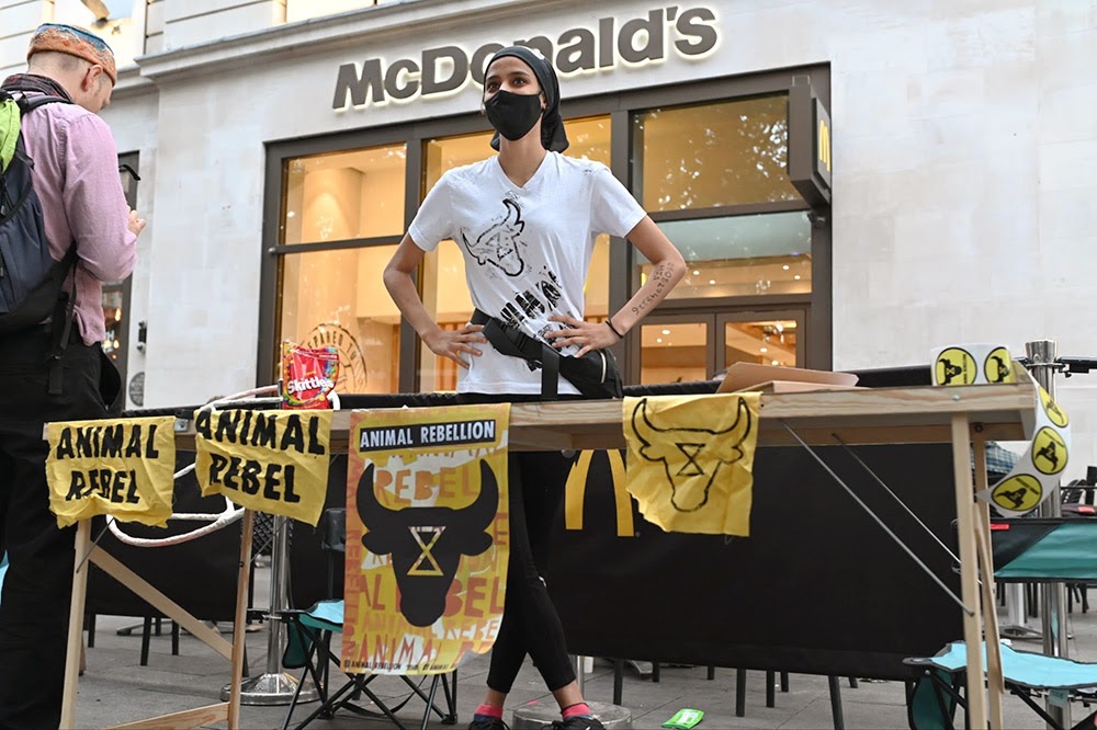 Animal Rebellion held crisis talks over McDonald’s tables in central London, part of their campaign to make the restaurant chain plant-based by 2025.