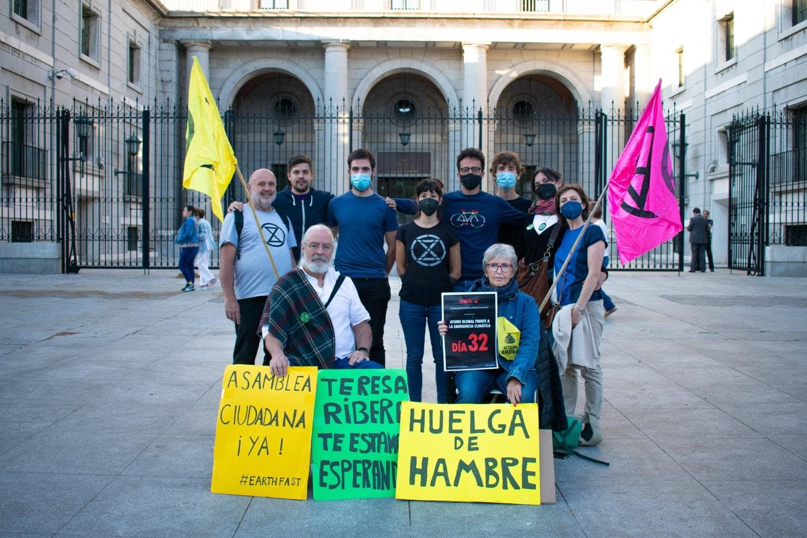29 SEP | Madrid, Spain The last 2 rebels taking part in the Earth Fast campaign (seated) end their fast after an amazing 32 days. They were holding out for a meeting with the government and they got one. Their discussion with the Ecological Transition Minister achieved little, but their fast attracted huge media interest and new recruits for XR’s cause.