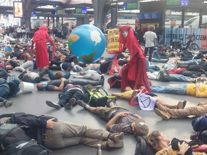 It started with a very large die-in. 250 rebels lifted an inflatable planet to the sky before falling to the stone floor of Zürich’s main train station during rush hour. Commuters looked on as Red Rebels moved mournfully between the bodies.