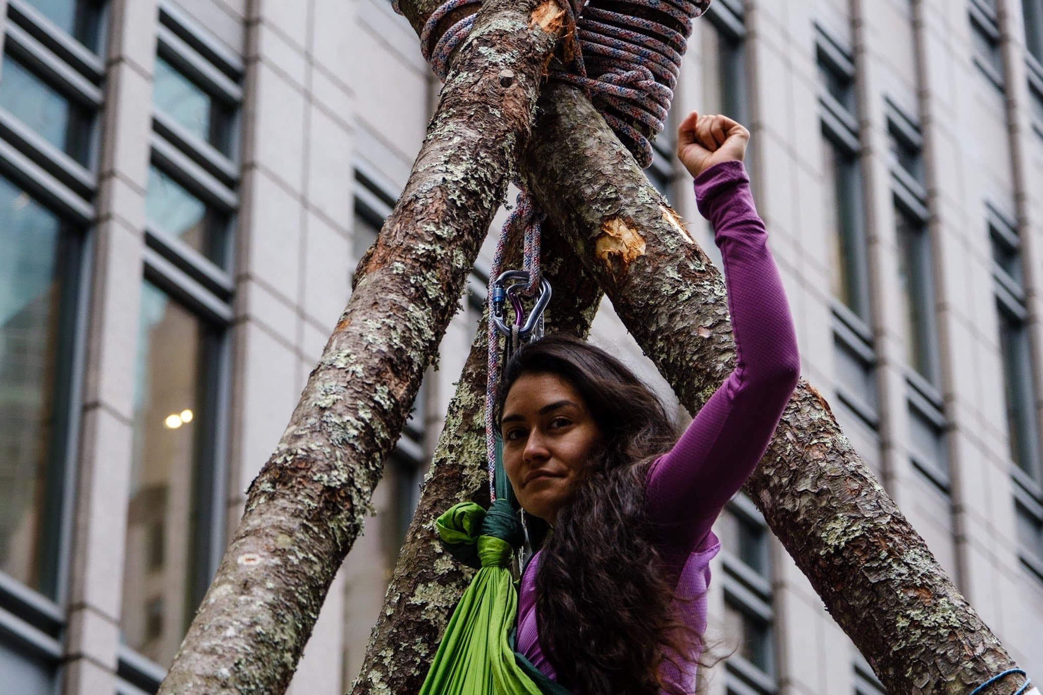 A New Yorker rebel atop a tripod outside JPMorgan Chase. Photo: Halide.hustle